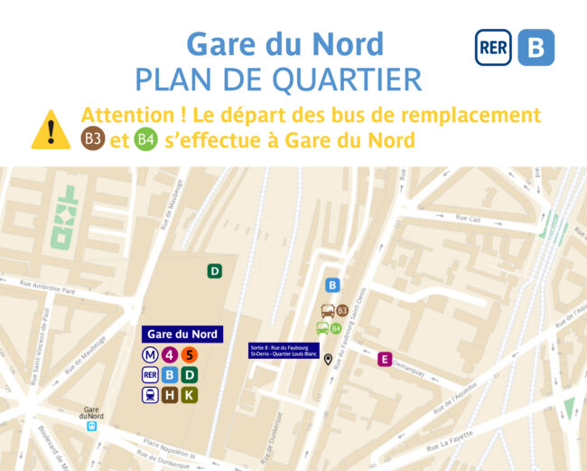 Bus de remplacement B4 entre Gare du Nord et Aéroport Charles de Gaulle desservant les gares suivantes, dans les deux sens de circulation