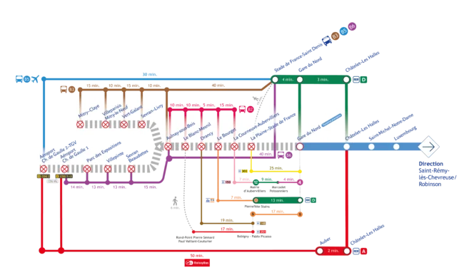 👉 RER ligne D Pierrefitte-Stains > Tram ligne T11 Le Bourget