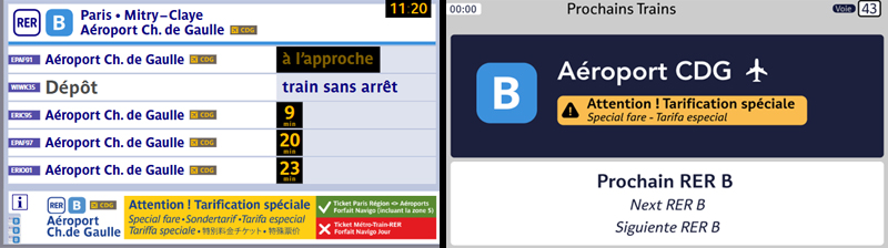 Pour accompagner les voyageurs qui n’auraient pas le bon titre pour se rendre à l’aéroport, des messages sont diffusés, depuis peu sur la partie sud de la ligne et à Gare du Nord, depuis les écrans disposés sur les quais :