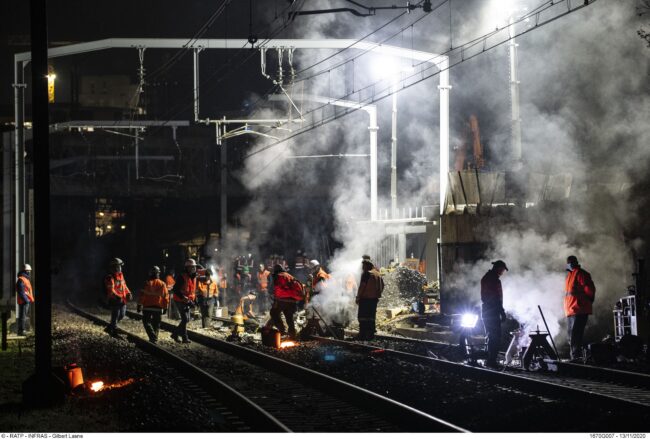 Dans ce cadre, une multitude d’engins a été utilisée sur ces deux chantiers, parmi lesquels : pelles rail-route, dumper et camions d’évacuation des déblais, bourrage mécanique lourd, portique de pose radiocommandé adapté au remplacement d’appareils de voie, compacteur et une grue de 100 tonnes pour acheminer les trois pièces de l’un des appareils de voie. La complexité de ce chantier d’importance en illustrations, c’est ci-dessous (Copyright : RATP INFRASTRUCTURES / Gilbert Lasne)