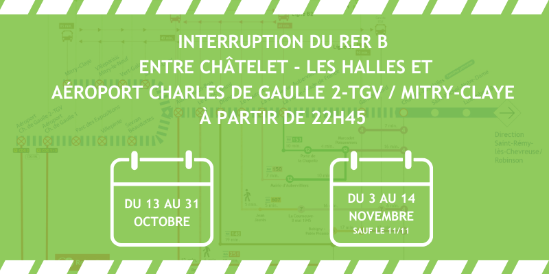 Du lundi 13 octobre au vendredi 14 novembre, du lundi au vendredi, le trafic sera interrompu entre Châtelet – Les Halles et Aéroport Charles de Gaulle 2-TGV/ Mitry-Claye, à partir de 22h45, dans les deux sens de circulation. Le trafic reprend chaque lendemain matin. Il n’y aura pas d’interruption prévue le mardi 11 novembre.