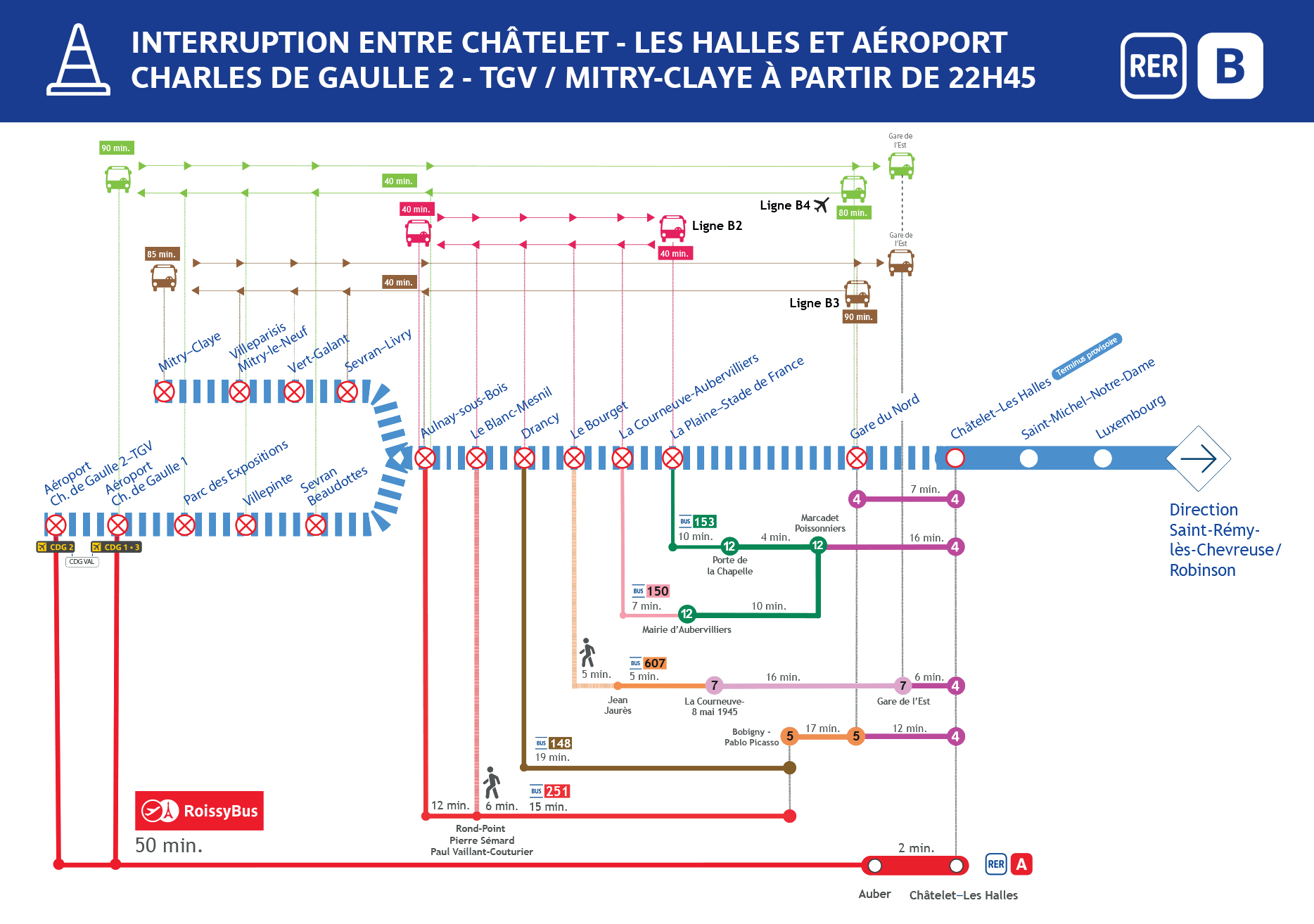 En soirée, à partir de 22h45, le trafic du RER B sera interrompu entre Châtelet – Les Halles et Aéroport CDG2-TGV/Mitry-Claye, dans les deux sens, jusqu’à la fin de service. Comment vous déplacer ?