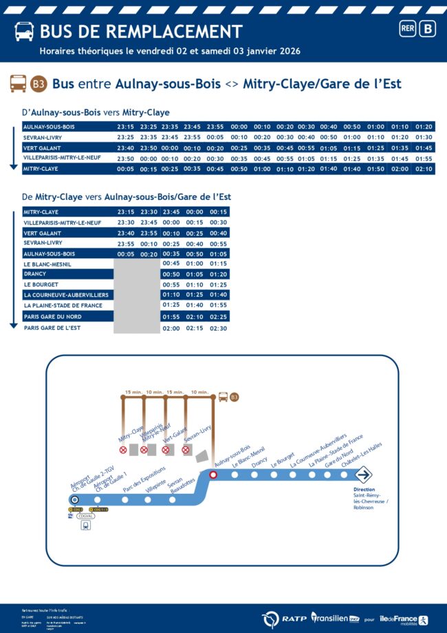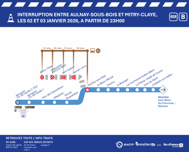 Le vendredi 02 et le samedi 03 janvier 2026, le trafic du RER B sera interrompu entre Aulnay-sous-Bois et Mitry-Claye, à partir de 23h00. Comment vous déplacer ? Toutes les infos sont ici :
