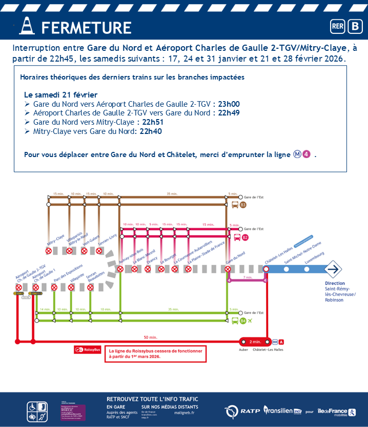 Les samedis 17, 24 et 31 janvier ainsi que les 21 et 28 février 2026, à partir de 22h45, le trafic du RER B sera interrompu pour travaux.