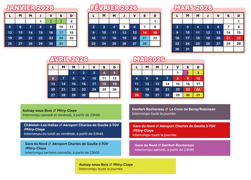 Du 5 janvier au 28 mai, du lundi au vendredi, le trafic sera interrompu entre Châtelet – Les Halles et Aéroport Charles de Gaulle 2-TGV/ Mitry-Claye, à partir de 22h45, du lundi au vendredi, dans les deux sens de circulation. Le trafic reprend chaque lendemain matin. Aucune interruption de ce type n’est prévue les 5 janvier, 6 avril, et les 1, 8, 14, 15, 25 et 29 mai.