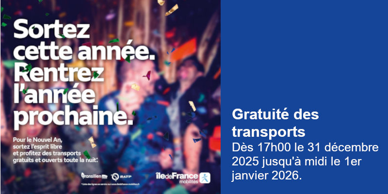 • Pour tout savoir sur cette soirée du nouvel an, rendez-vous sur le site d’Île-de-France Mobilités, depuis la page dédiée : Vos transports sont ouverts toute la nuit le soir du 31.