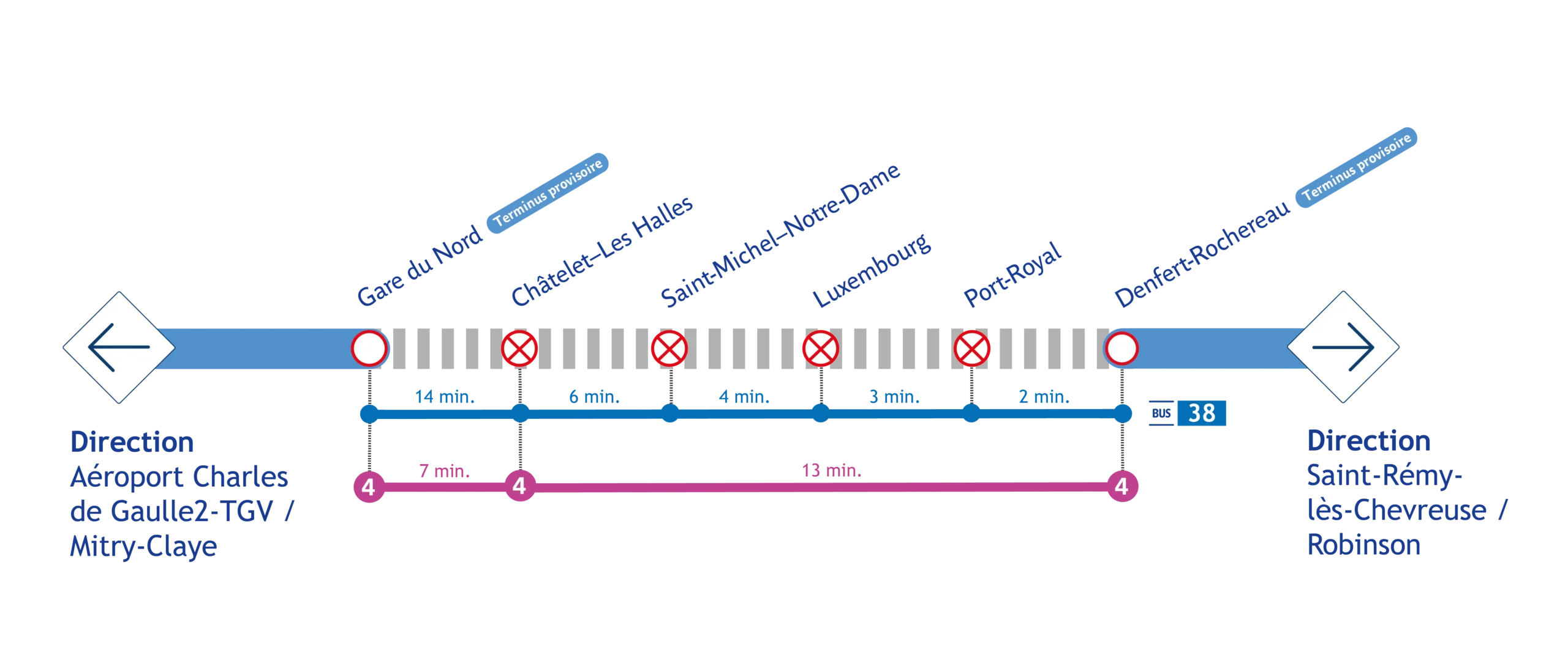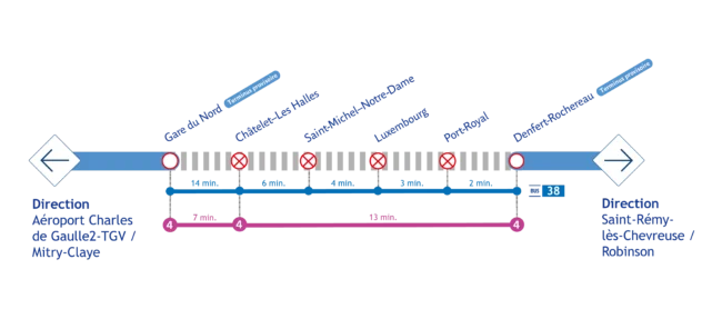 Pour vous rendre de Gare du Nord à Denfert-Rochereau ou aux gares intermédiaires, nous vous recommandons d’emprunter :